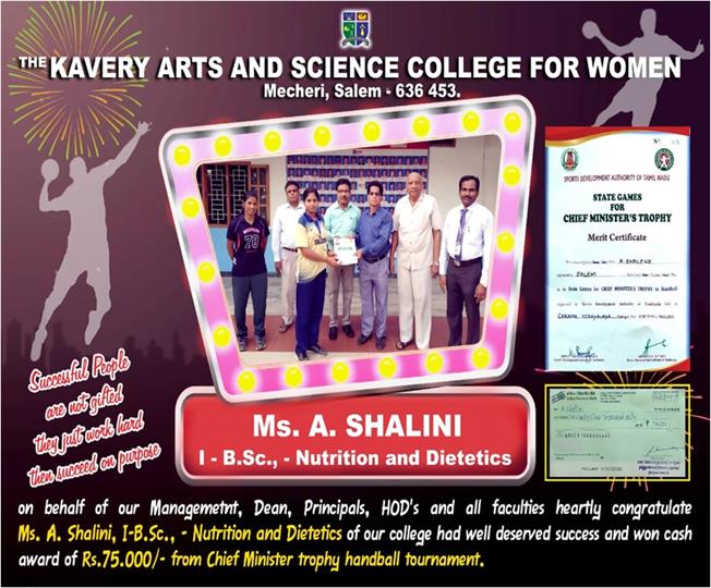 In STATE GAMES FOR CHIEF MINISTER TROPHY, Miss.A.Shalini of Nutrition and Dietetics department had secured second place and won the cash prize award worth 75,000/.
